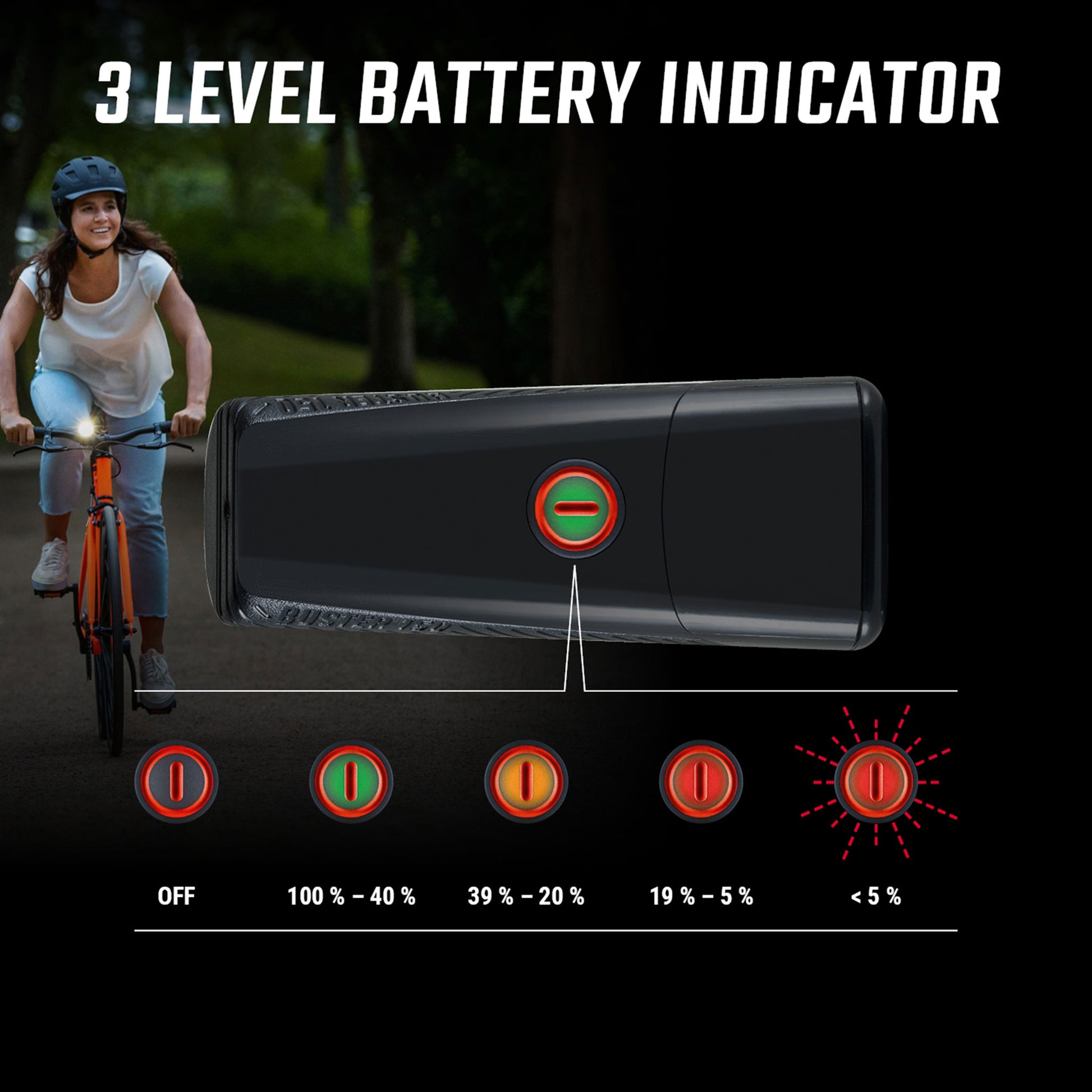 - Five light modes: power mode (150 lm), mid mode (75 lm), low mode (35 lm), night flashing (100/140 lm), day flashing (40 lm)