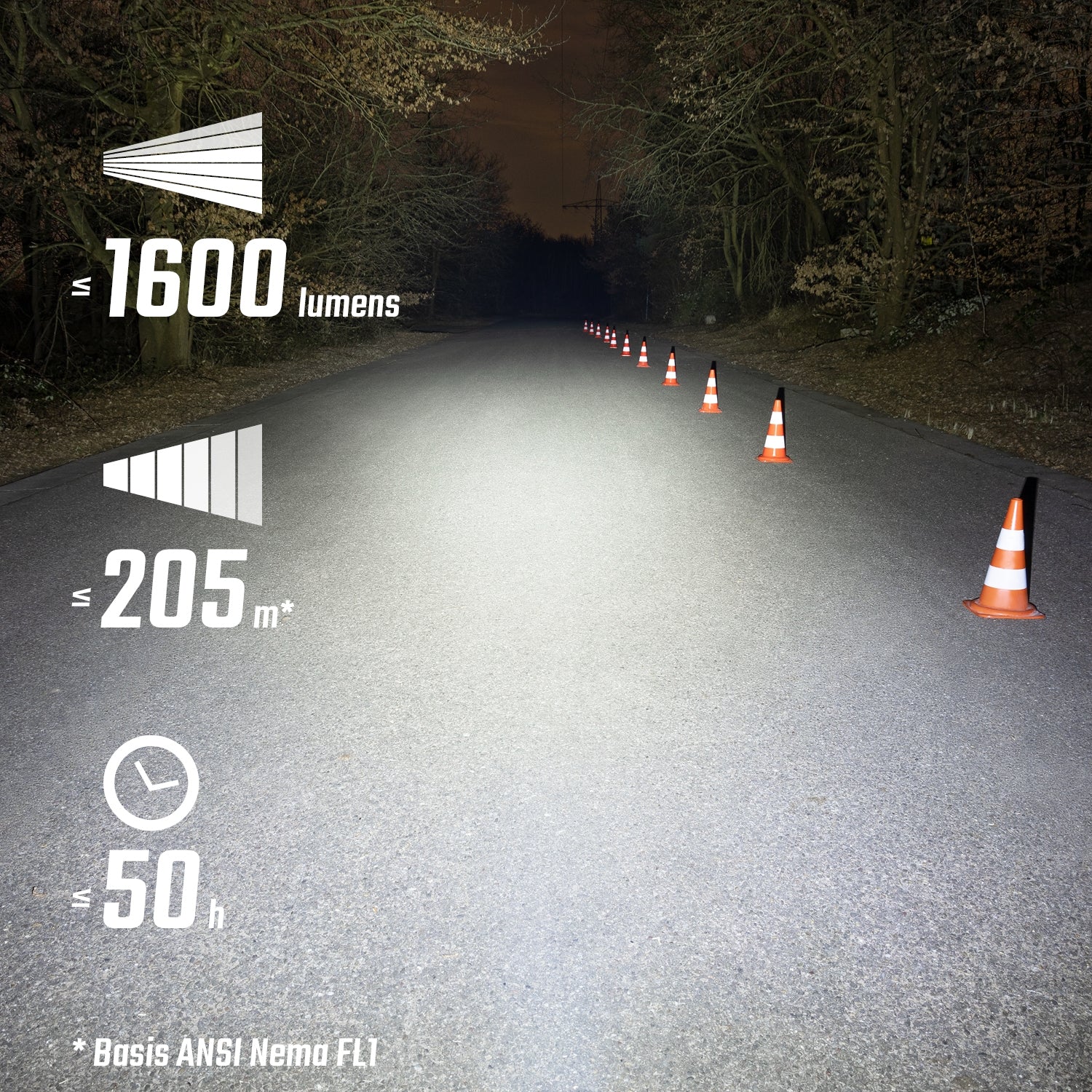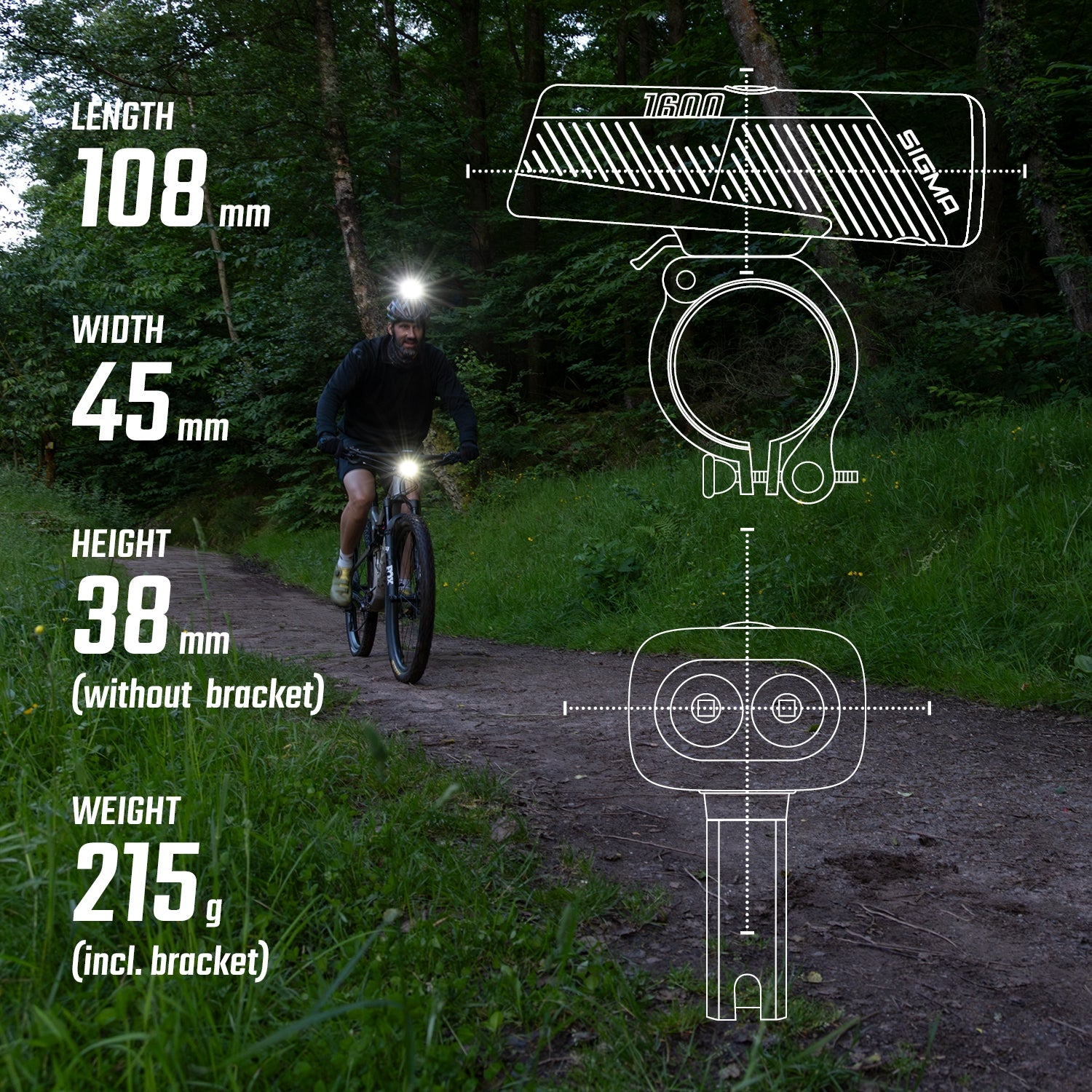 - Six light modes: High (= 1600 lm), Mid (= 1000 lm), Low (= 500 lm), Eco (= 150 lm), Night flashing (= 800/400 lm) Day flashing (= 200 lm)